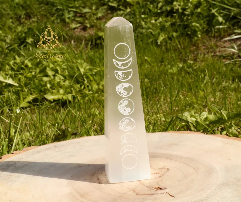 L’obélisque de sélénite avec ses dessins lunaires est une pièce à la fois esthétique et spirituelle, parfaite pour purifier un espace.
