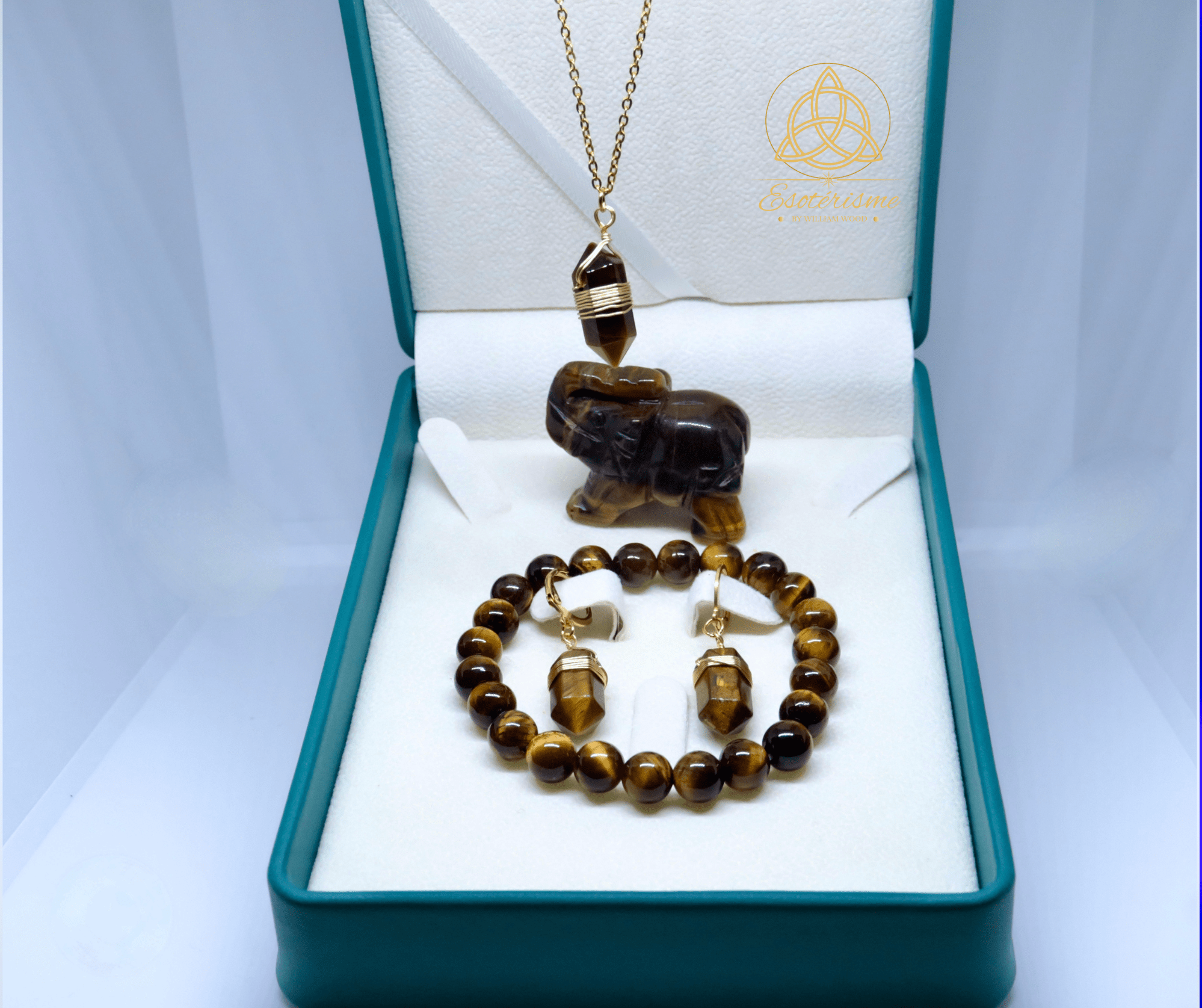 Le coffret de Noël œil de tigre est une idée cadeau pleine d’énergie et de symbolique. Il réunit plusieurs pièces uniques :