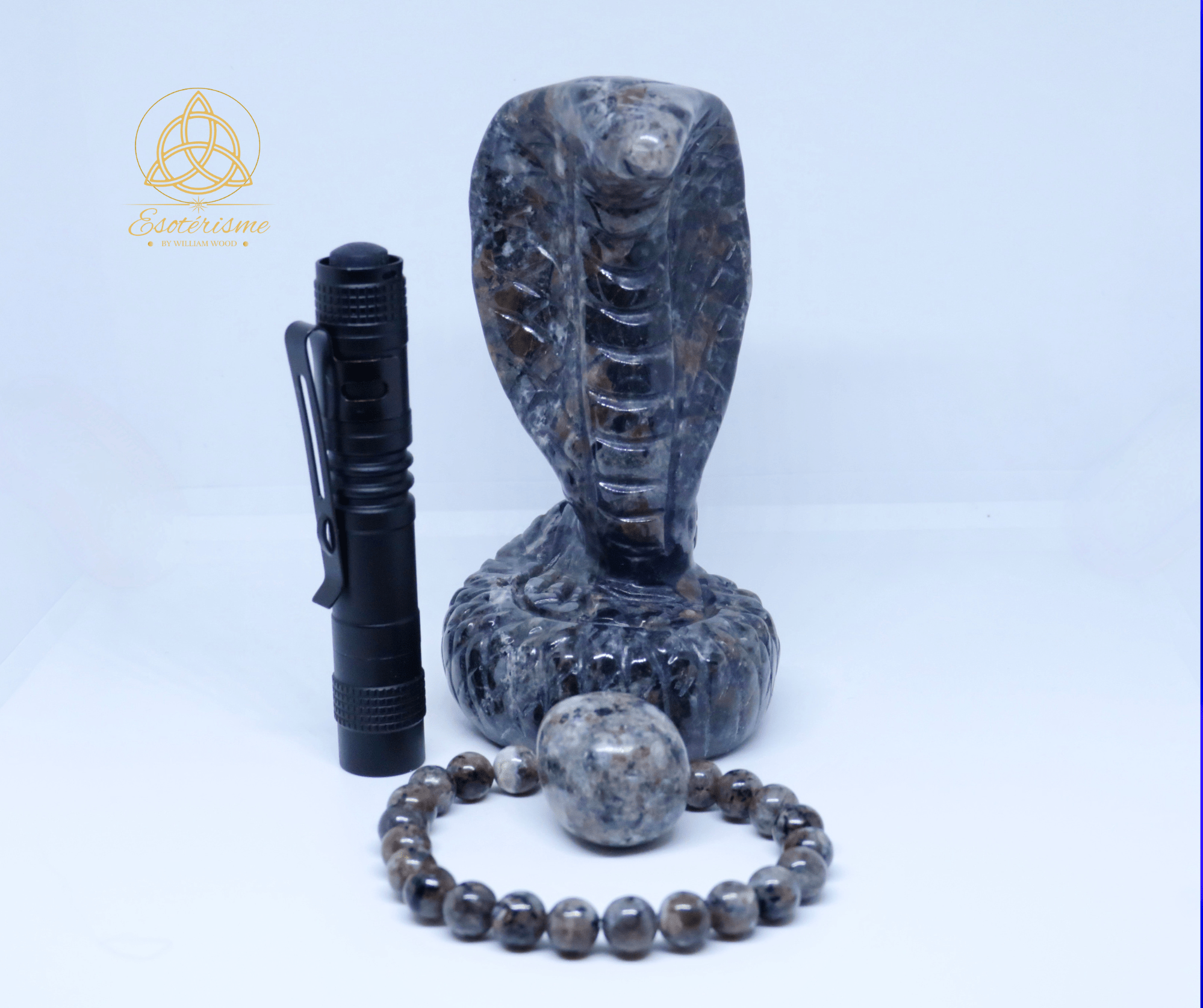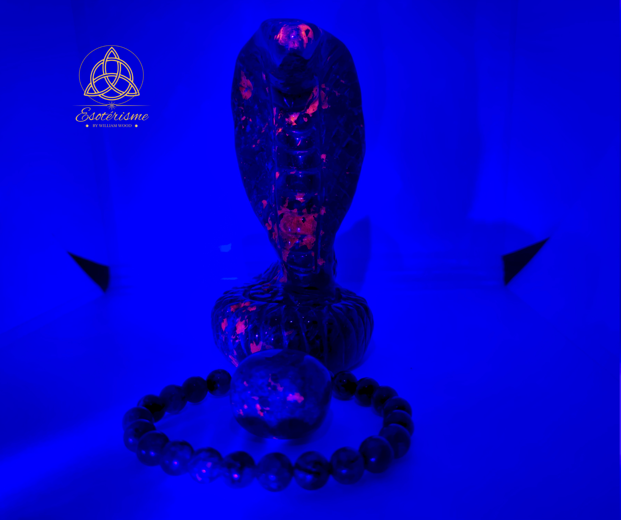 Le bracelet Yooperlite diffuse une énergie apaisante et protectrice tout au long de la journée. La pierre roulée, utilisée en méditation, recentre l’esprit et équilibre les énergies d’un lieu, le serpent véritable sculpture fait main, Symbole ancestral de transformation, de guérison et d’énergie vitale, le serpent incarne la renaissance et le pouvoir intérieur. Quant à la lampe UV, elle révèle la beauté cachée de la pierre et transforme chaque utilisation en un rituel fascinant, où la lumière danse comme un serpent mystique.