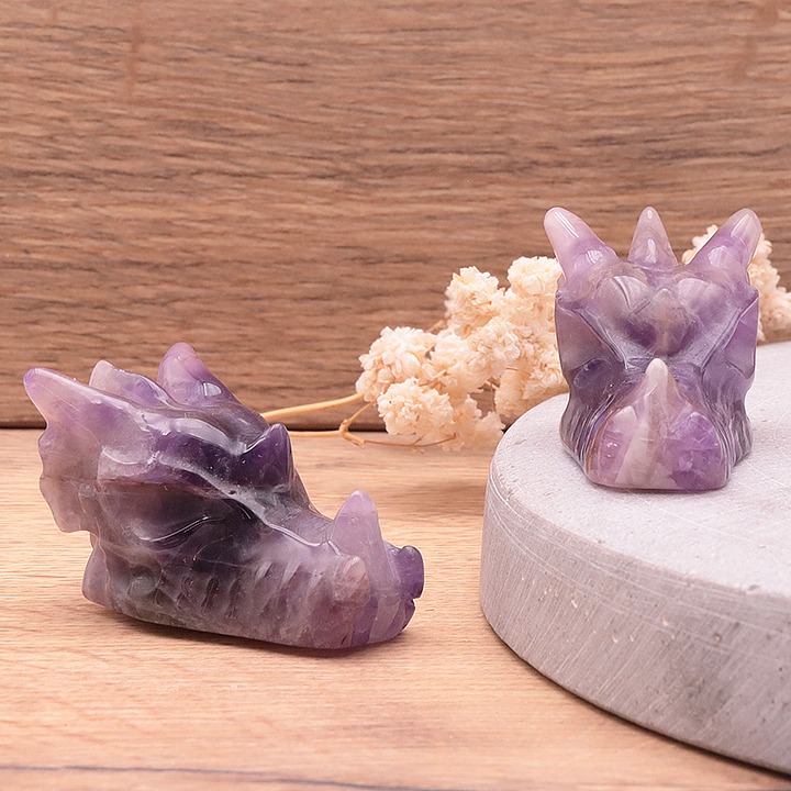 L’améthyste apporte une énergie calme, ce qui permet d’éclaircir les pensées et d’apaiser les tensions. Grâce à sa vibration élevée, elle chasse les influences négatives et renforce l’intuition. Ainsi, lorsque l’améthyste est sculptée sous forme de Tête de Dragon, elle intensifie sa capacité à protéger, purifier et guider l’esprit.