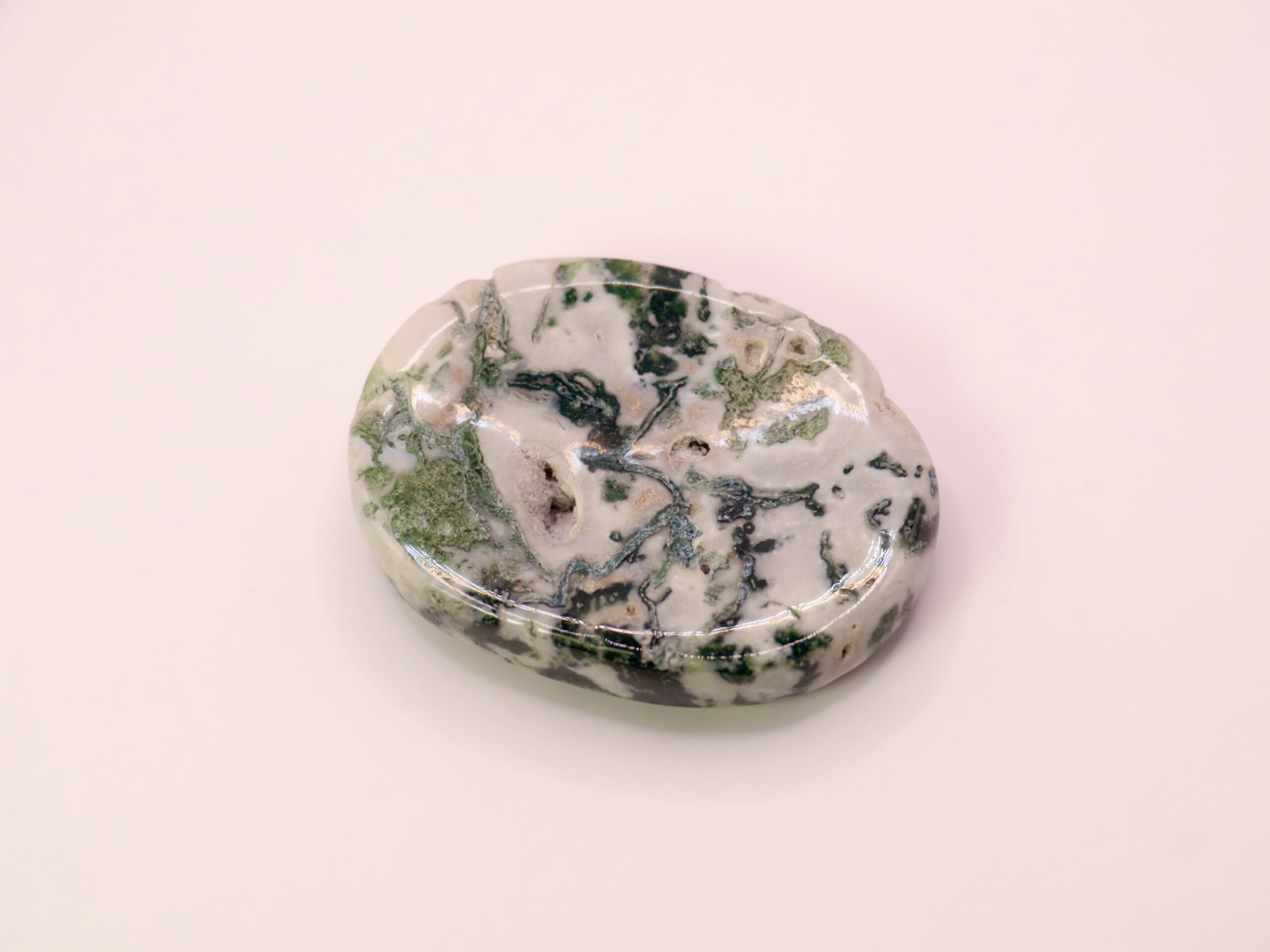 La pierre est légèrement creusée afin d’effectuer un mouvement de frottement avec le pouce qui permet de diminuer le stress.